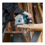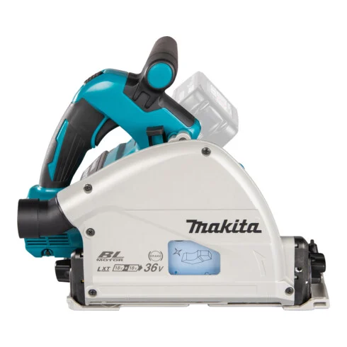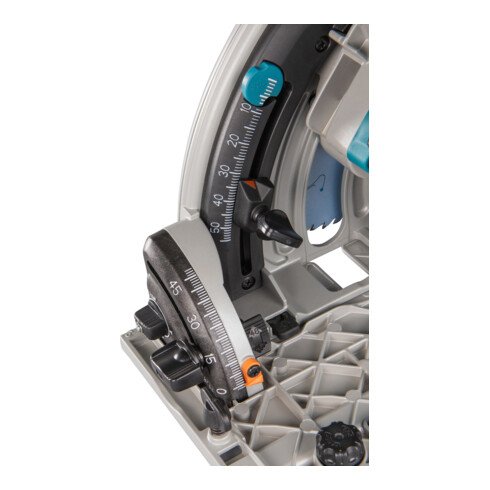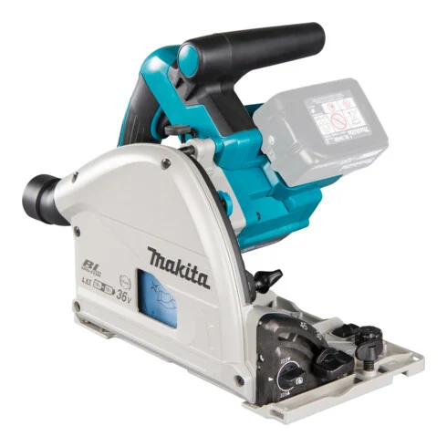 Eine präzise Tauchkreissäge mit bürstenlosem Motor. Die Säge erreicht mit einem Sägeblattdurchmesser von 165 mm eine Schnitttiefe von 56 mm. Der Schnittpunkt bleibt in allen Neigungen (-1° bis +48°) an exakt der gleichen Stelle. Die Säge kippt auch bei größtem Neigungswinkel nicht von der Führungsschiene.